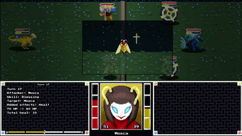 Oh, also, the current last boss fight's balance is completely broken. First try, got unlucky and everyone targetted Mosca so without healing I Game Over'd before the 20 second timelimit was up. Second try, two stat points later (note: I had never Game Over'd before this point, or otherwise gotten more than the minimum number of stat points possible), and... after targetting the real boss with everyone and slowing him down as soon as I got the chance, I was able to bring him down before he could kill anyone. From there, I was doing well enough that I could heal up and start working on the other two, and had almost gotten their healer down, when... the 20 second time limit finally ended. At which point, a cutscene played out treating things as if all the enemy team had kicked my ass as hard as they did the first time and were just sparing me, even though I would have won this time around if they fight kept going.