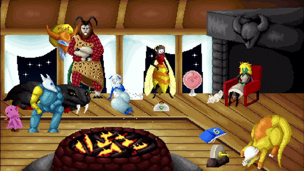 Another far more noticeable change are the character sprites in the main hub. I decided to make them slightly larger since I was making a bunch of new characters anyway. I think it looks better this way and I could even add optional interactions at certain points of the story, but certainly not until I'm done with the remaining levels. Anyway, here's a picture of most of the gang together. I find it rather cozy.